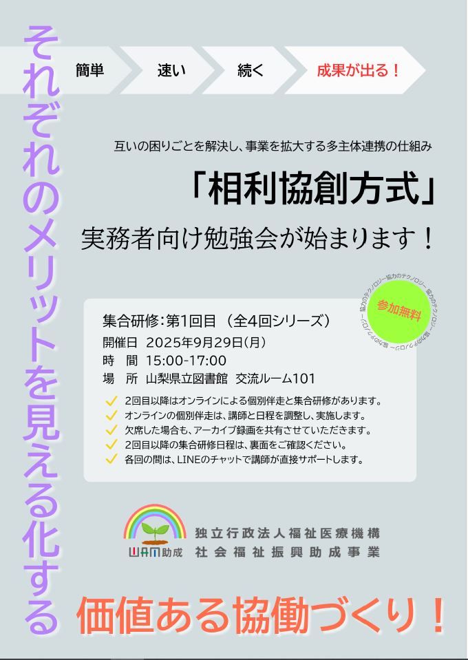 社会課題の複雑化や人口減少によるリソースの減少などに伴い、「一組織の力では限界がある」と感じることが増えていませんか? 「協力」や「連携」を重要だとは思うけれど、関係性の維持や、バランスを取ることに負担を感じている方も、少なくないと思います。この「相利協創方式」は、互いのメリットを可視化し、最適化することで、簡単・速い・続く・成果が出る、そんなメソッドです。